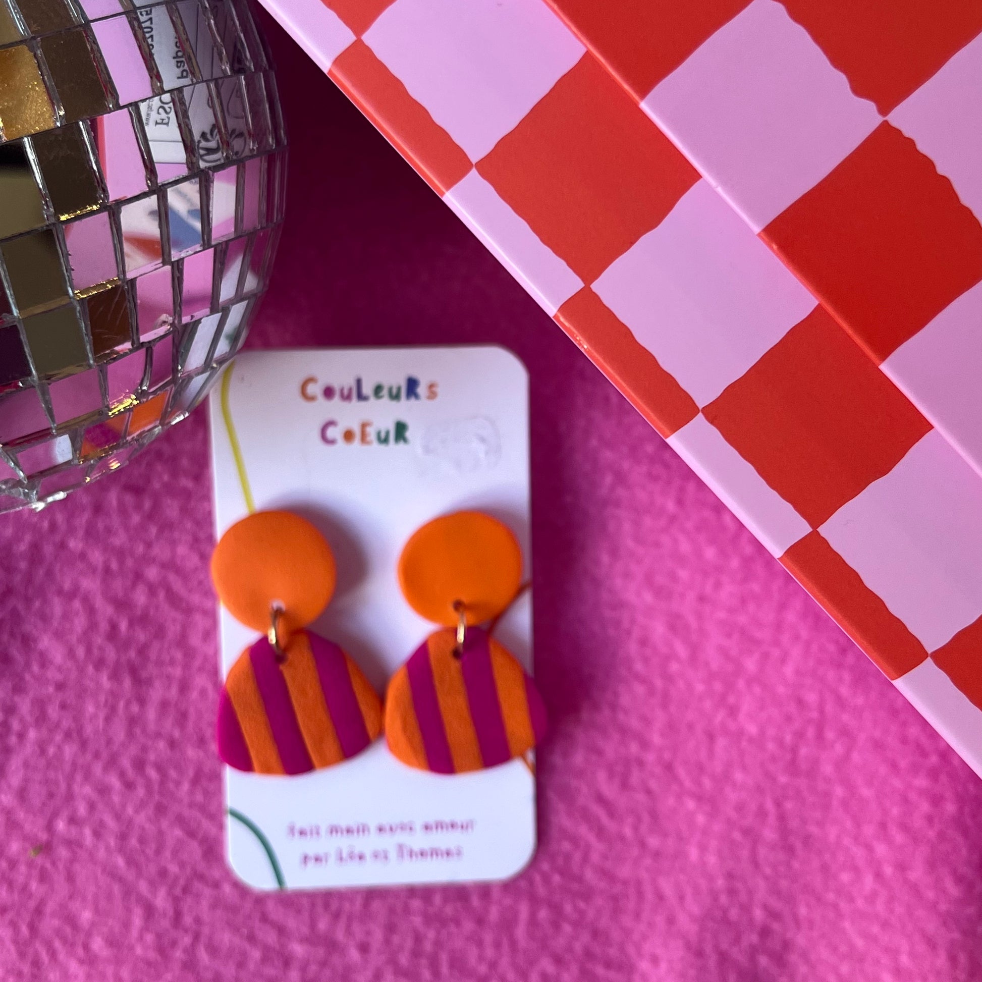 Boucles d'oreilles oranges et roses avec un motif vichy.