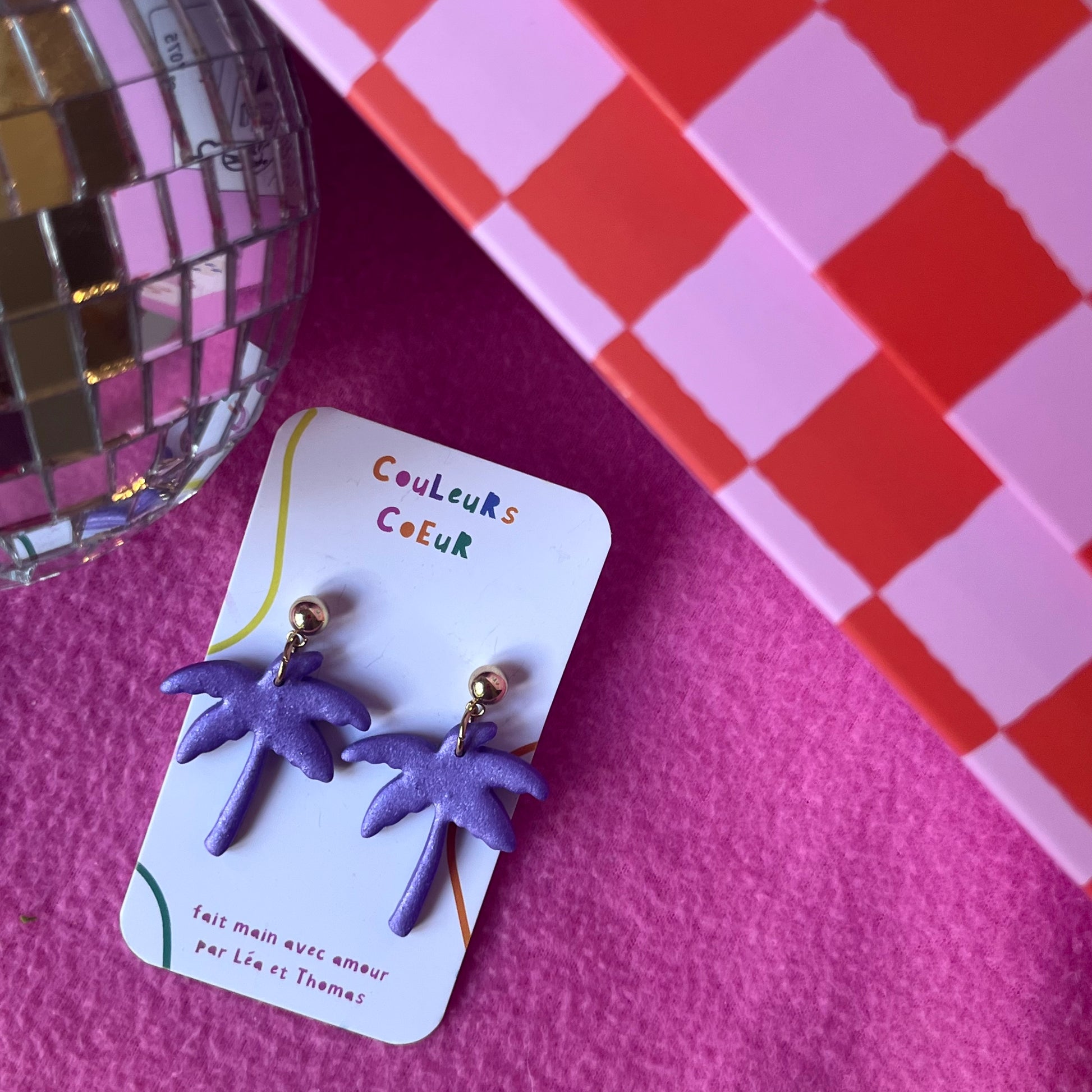 Boucles d'oreilles avec des palmiers mauves.