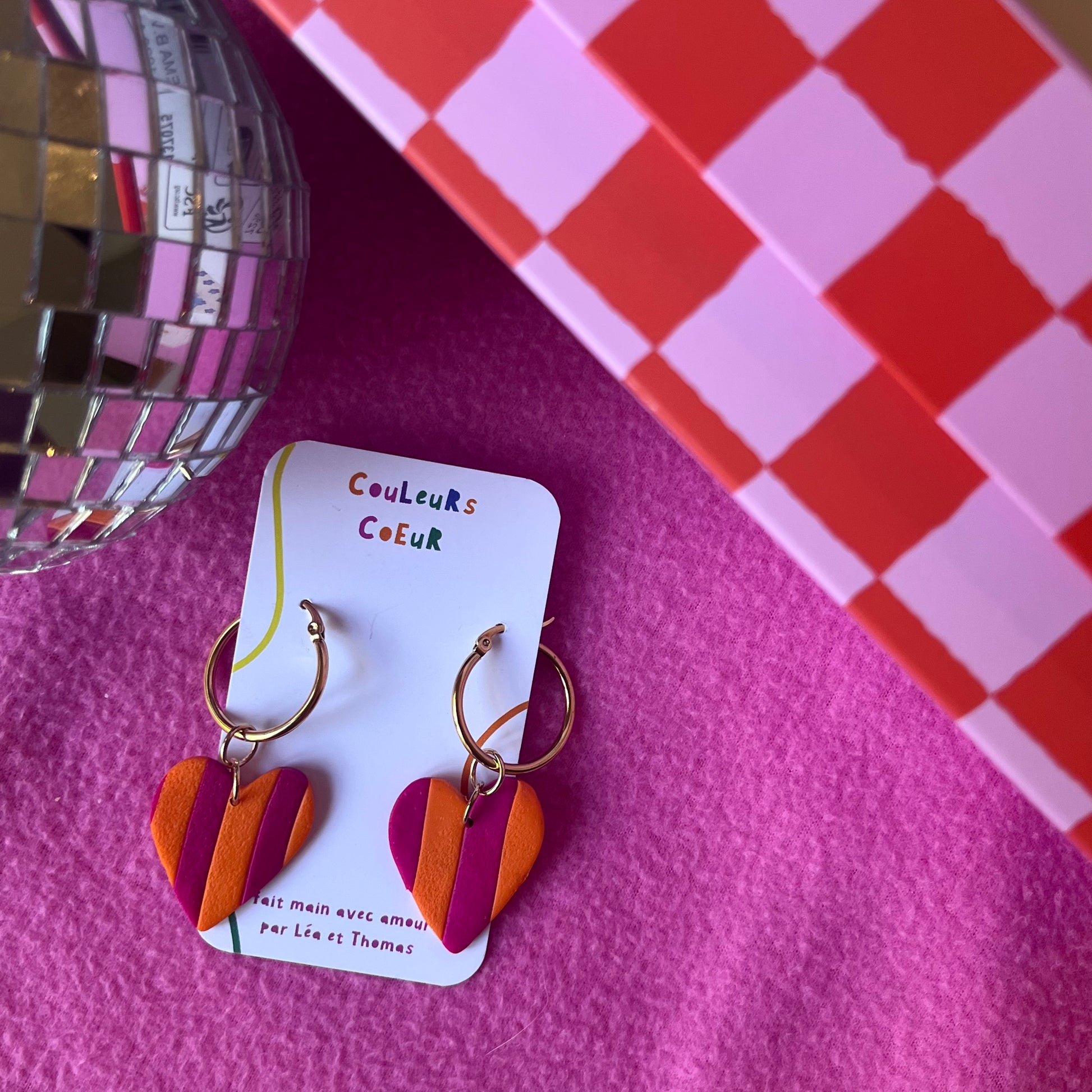 Boucles d'oreilles oranges & roses à rayures. Avec un anneau