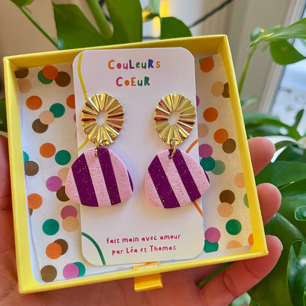 Boucles d'oreilles rayures violettes & roses avec des paillettes.
