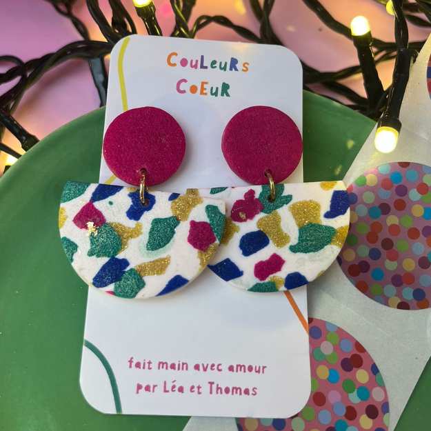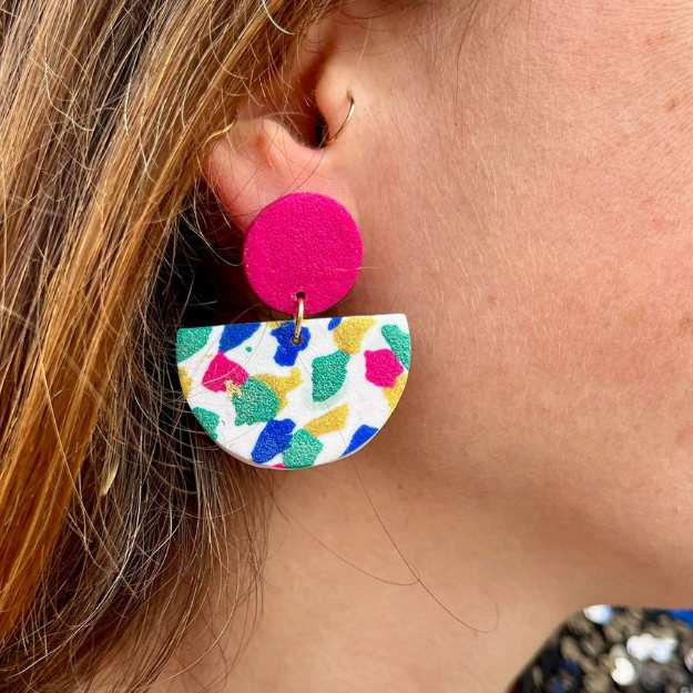 Boucles d'oreilles terrazzo avec une accroche rose.