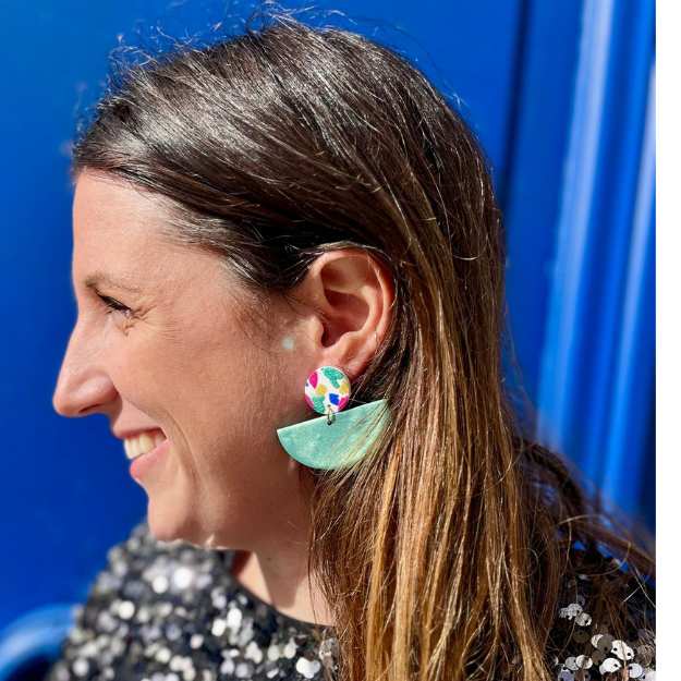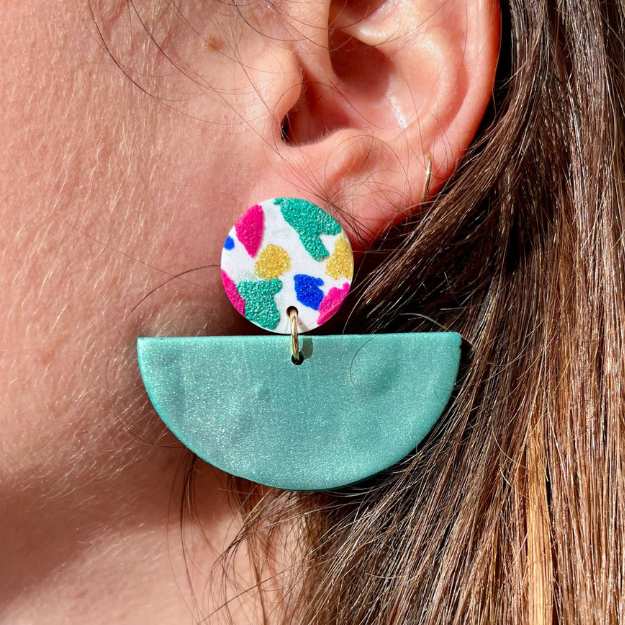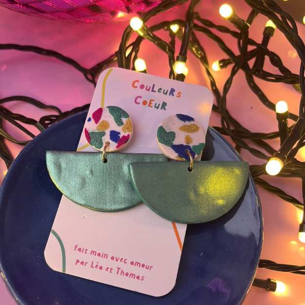 Modèle vert irisé avec un joli terrazzo rose, doré, bleu & vert.