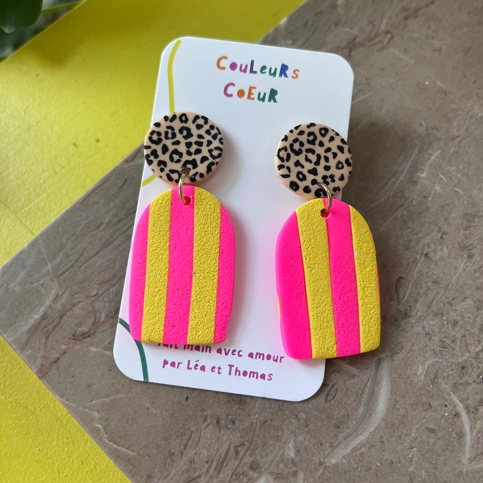 Boucles d'oreilles à rayures roses fluo & jaunes avec des ronds léopard.