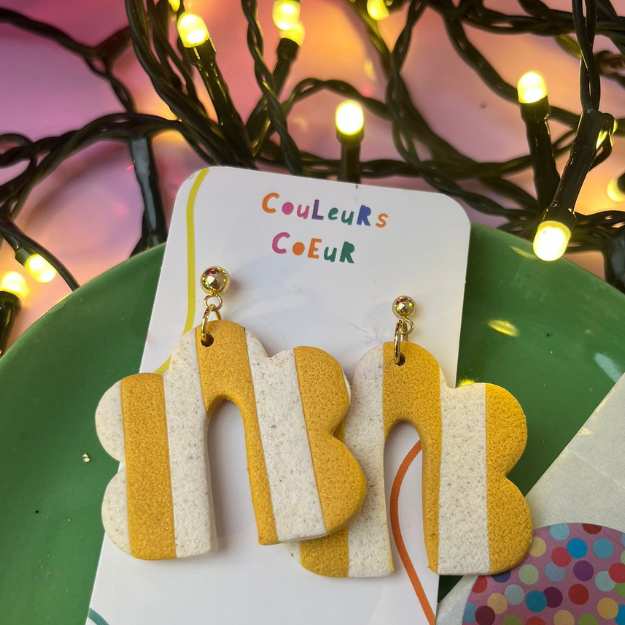 Boucles d'oreilles à rayures ocres & blanches pailletées.