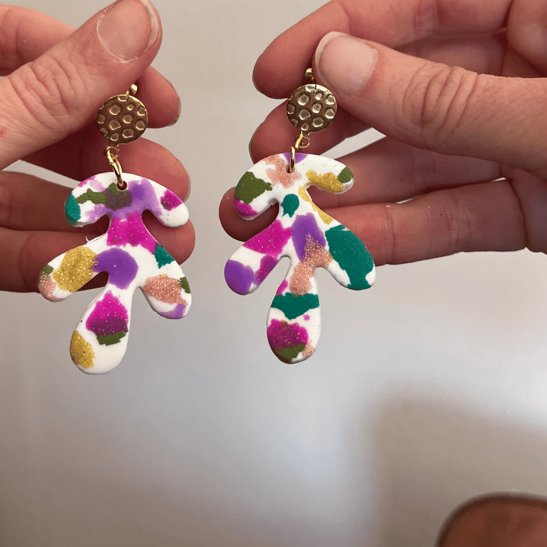 Boucles d'oreilles terrazzo kaki/vert/violette/rose fushia & doré pailletée.