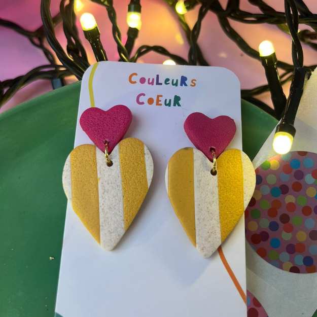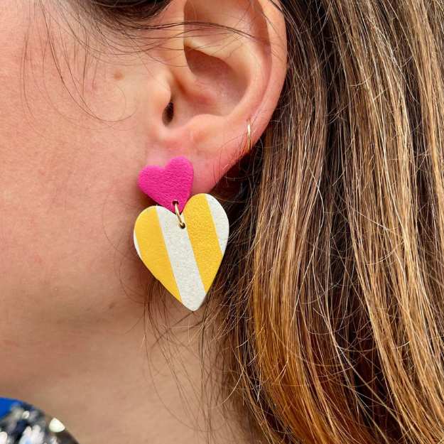Boucles d'oreilles terrazzo avec une accroche rose.