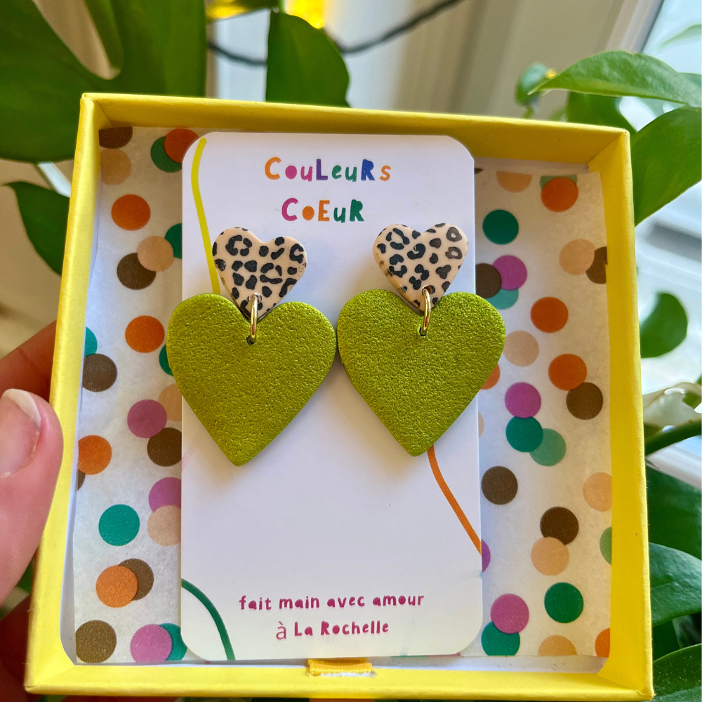 Boucles d'oreilles avec double coeur vert pistache & léopard.